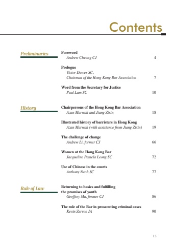 13ForewordAndrew Cheung CJ 4PrologueVictor Dawes SC,Chairman of the Hong Kong Bar Association 7Word from the Secretary for JusticePaul Lam SC 10Chairpersons of the Hong Kong Bar AssociationAzan Marwah and Jiang Zixin 18Illustrated history of barristers in Hong KongAzan Marwah (with assistance from Jiang Zixin) 19The challenge of changeAndrew Li, former CJ 66Women at the Hong Kong Bar Jacqueline Pamela Leong SC 72Use of Chinese in the courts Anthony Neoh SC 77Returning to basics and fulfillingthe promises of youthGeoffrey Ma, former CJ 86The role of the Bar in prosecuting criminal casesKevin Zervos JA 90ContentsHistoryPreliminariesRule of Law
