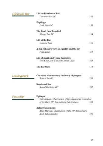 15Life at the criminal BarLawrence Lok SC 146PupillagePaul Shieh SC 150The Road Less TravelledWinnie Tam SC 154Life at the Bar Osmond Lam 156A Bar Scholar's view on equality and the lawPuja Kapai 159Life of pupils and young barristersToni Chan, Ian Chu and Christy Chak 169The Bar Mess 173Our sense of community and unity of purposeRonald Arculli 180Bench and Bar Kemal Bokhary NPJ 182Epilogue Catrina Lam, Chairperson of the Organising Committee of the Bar%u2019s 75th Anniversary Celebrations 188AcknowledgementsAzan Marwah, Chairperson of the 75th AnniversaryBook Subcommittee 191Life at the BarLooking BackPostscript