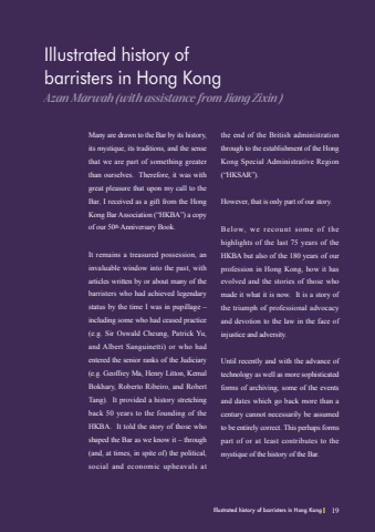 19Illustrated history ofbarristers in Hong KongAzan Marwah (with assistance from Jiang Zixin )Many are drawn to the Bar by its history, its mystique, its traditions, and the sense that we are part of something greater than ourselves. Therefore, it was with great pleasure that upon my call to the Bar, I received as a gift from the Hong Kong Bar Association (%u201cHKBA%u201d) a copy of our 50th Anniversary Book.It remains a treasured possession, an invaluable window into the past, with articles written by or about many of the barristers who had achieved legendary status by the time I was in pupillage %u2013 including some who had ceased practice (e.g. Sir Oswald Cheung, Patrick Yu, and Albert Sanguinetti) or who had entered the senior ranks of the Judiciary (e.g. Geoffrey Ma, Henry Litton, Kemal Bokhary, Roberto Ribeiro, and Robert Tang). It provided a history stretching back 50 years to the founding of the HKBA. It told the story of those who shaped the Bar as we know it %u2013 through (and, at times, in spite of) the political, social and economic upheavals at the end of the British administration through to the establishment of the Hong Kong Special Administrative Region (%u201cHKSAR%u201d). However, that is only part of our story. Below, we recount some of the highlights of the last 75 years of the HKBA but also of the 180 years of our profession in Hong Kong, how it has evolved and the stories of those who made it what it is now. It is a story of the triumph of professional advocacy and devotion to the law in the face of injustice and adversity.Until recently and with the advance of technology as well as more sophisticated forms of archiving, some of the events and dates which go back more than a century cannot necessarily be assumed to be entirely correct. This perhaps forms part of or at least contributes to the mystique of the history of the Bar.Illustrated history of barristers in Hong Kong 19