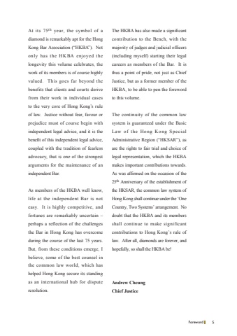 5At its 75th year, the symbol of a diamond is remarkably apt for the Hong Kong Bar Association (%u201cHKBA%u201d). Not only has the HKBA enjoyed the longevity this volume celebrates, the work of its members is of course highly valued. This goes far beyond the benefits that clients and courts derive from their work in individual cases to the very core of Hong Kong%u2019s rule of law. Justice without fear, favour or prejudice must of course begin with independent legal advice, and it is the benefit of this independent legal advice, coupled with the tradition of fearless advocacy, that is one of the strongest arguments for the maintenance of an independent Bar.As members of the HKBA well know, life at the independent Bar is not easy. It is highly competitive, and fortunes are remarkably uncertain %u2013 perhaps a reflection of the challenges the Bar in Hong Kong has overcome during the course of the last 75 years. But, from these conditions emerge, I believe, some of the best counsel in the common law world, which has helped Hong Kong secure its standing as an international hub for dispute resolution. The HKBA has also made a significant contribution to the Bench, with the majority of judges and judicial officers (including myself) starting their legal careers as members of the Bar. It is thus a point of pride, not just as Chief Justice, but as a former member of the HKBA, to be able to pen the foreword to this volume. The continuity of the common law system is guaranteed under the Basic Law of the Hong Kong Special Administrative Region (%u201cHKSAR%u201d), as are the rights to fair trial and choice of legal representation, which the HKBA makes important contributions towards. As was affirmed on the occasion of the 25th Anniversary of the establishment of the HKSAR, the common law system of Hong Kong shall continue under the %u2018One Country, Two Systems%u2019 arrangement. No doubt that the HKBA and its members shall continue to make significant contributions to Hong Kong%u2019s rule of law. After all, diamonds are forever, and hopefully, so shall the HKBA be!Andrew CheungChief JusticeForeword